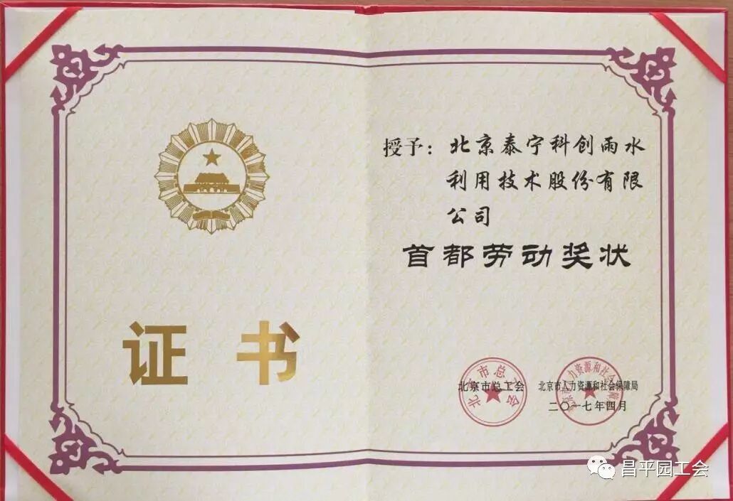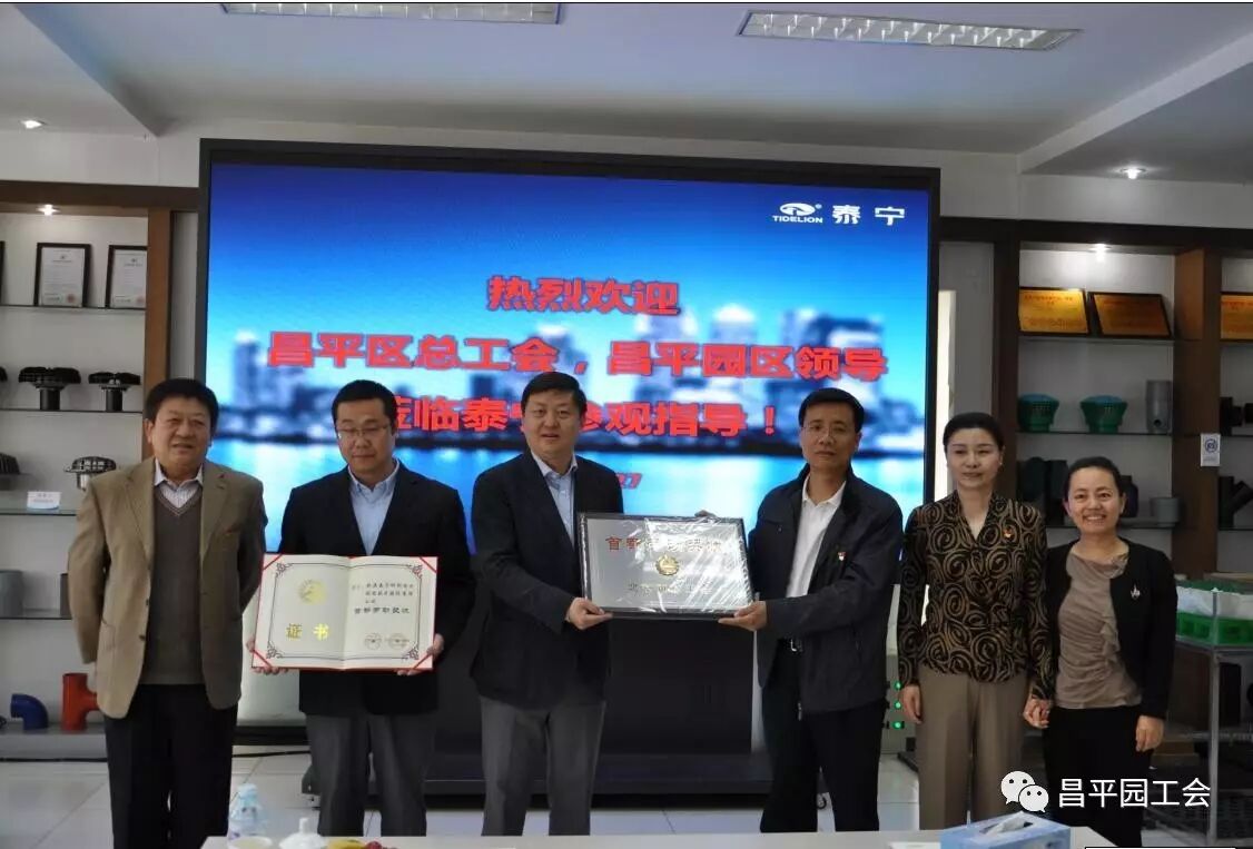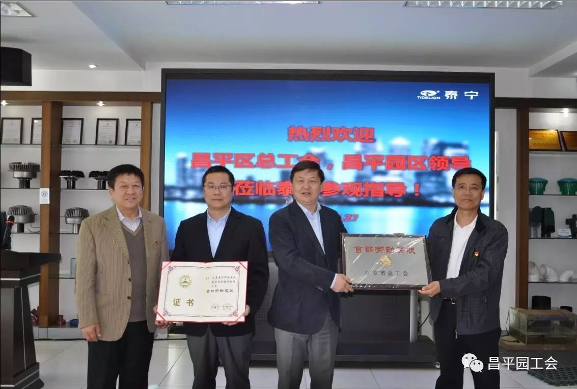 4月27日,昌平区总工会主席郭自成、常务副主席金光、在昌平园工委副书记任旭明、工会主席钮亚敏的陪同下,来到北京泰宁科创雨水利用技术股份有限公司调研,并为泰宁公司颁发 “首都劳动奖状”奖牌和证书。