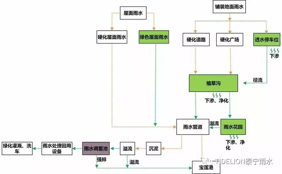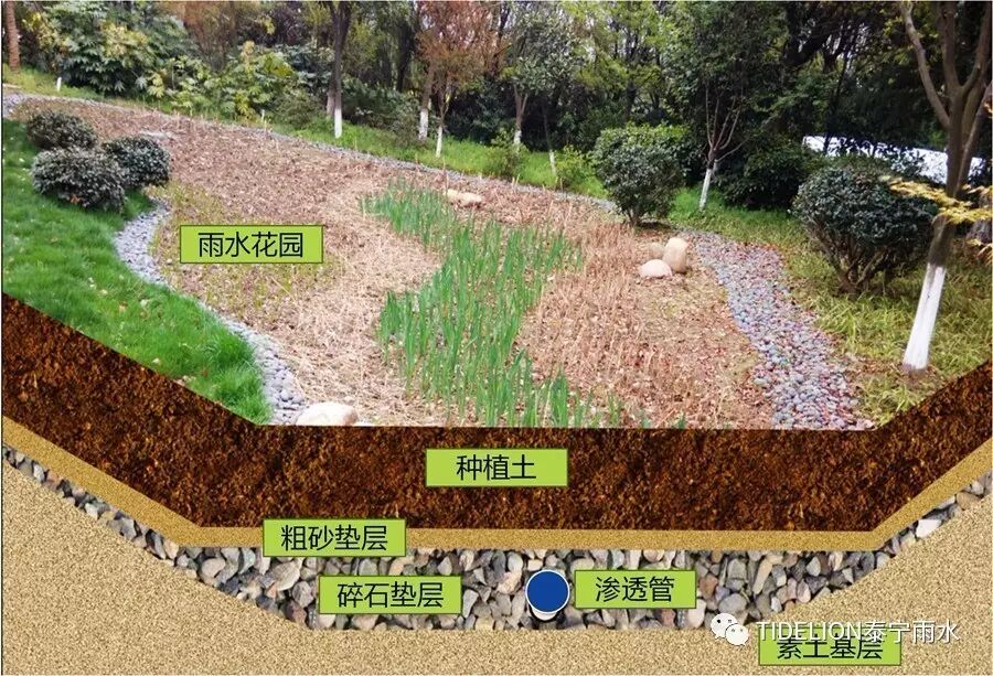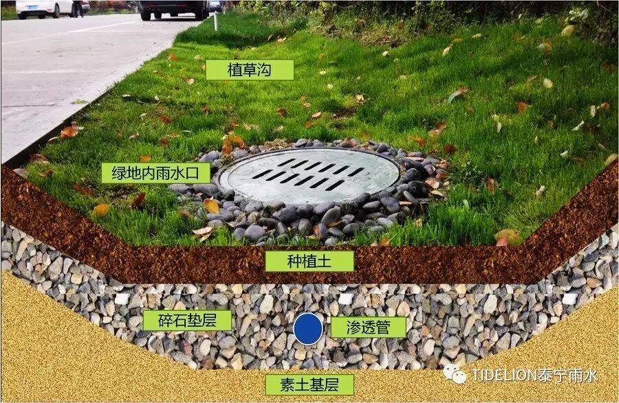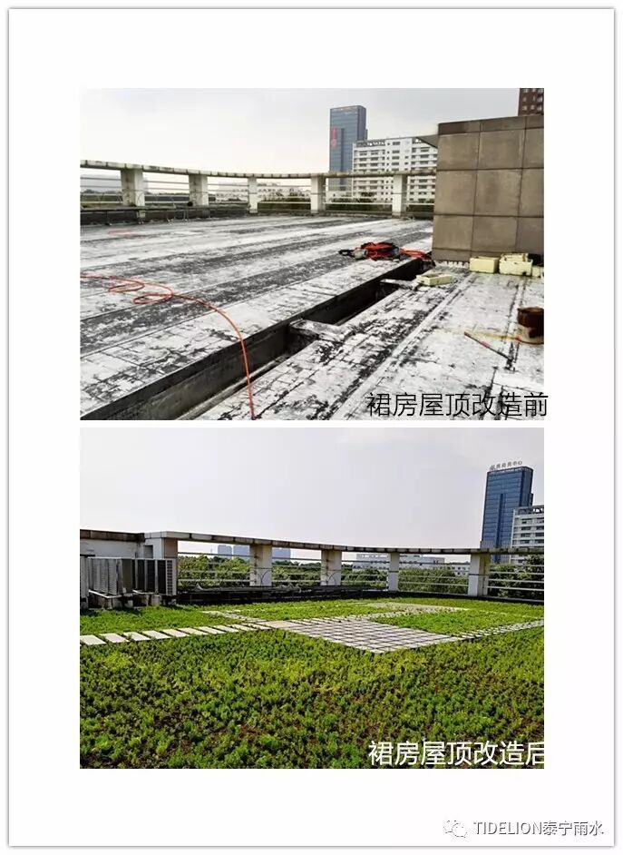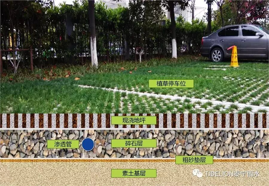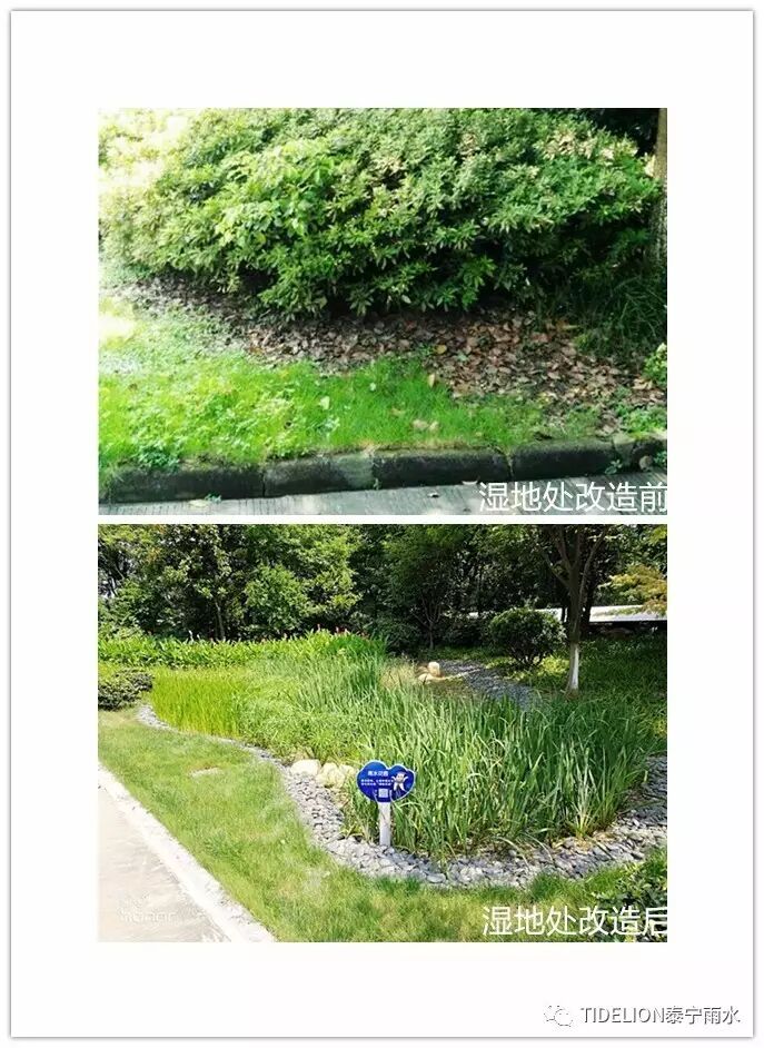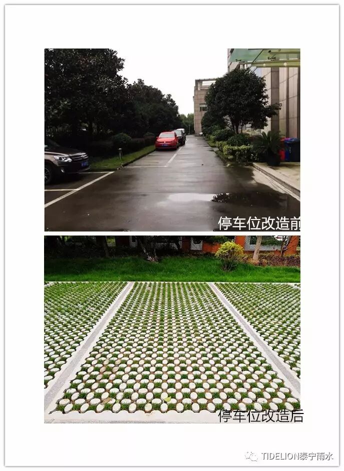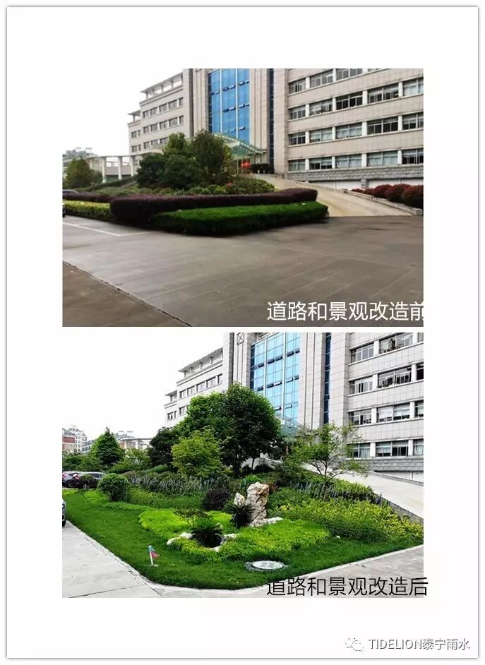 四、五大设施,各司其职 1. 植草沟 道路雨水找坡进入绿地,经过植草沟的过滤净化,对雨水进行污染物的去除。 2. 生物滞留设施 雨水花园从源头收集路面的雨水,雨水经植物和沙土的综合作用得到净化,并逐渐渗入土壤,涵养地下水。 3. 下沉式绿地 下沉式绿地广泛分布于区块内的道路、广场、停车位等区域的周围,其典型结构为绿地高程低于周围硬化地面5-25cm左右,绿地内设溢流雨水口。 4. 绿色屋顶 在配楼设绿色屋顶,绿色屋顶的主要植物为三七景天及佛甲草,绿色屋顶的雨水经过初期处理,屋面立管断接进入蓄水池,便于回用。 5. 植草透水停车位 对原有停车位进行透水改造,使得雨水能够通过透水结构就地下渗,从而达到控制地表径流、雨水利用等目的。