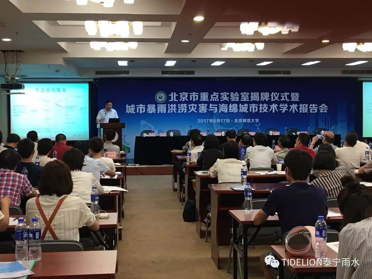 揭牌仪式之后召开了“城市暴雨洪涝灾害与海绵城市技术学术报告会”,全国人大环境与资源保护委员会副主任委员孟伟院士、 北京师范大学地学部傅伯杰院士、水利部南京水利科学研究院院长张建云院士、中国水利水电科学研究院副总工程师程晓陶教高、美国罗格斯大学郭祺忠(George Guo)教授做了报告,针对城市暴雨洪涝灾害防治与海绵城市建设相关问题,交流最新成果,探讨海绵城市建设面临的挑战。