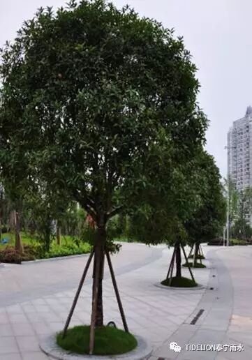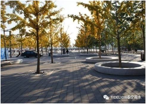 (4) 树池过滤 将车行道雨水引入树池,通过树池内土壤过滤或雨水收集口,收集于树池周围的储水模块内,有效滞蓄雨水。