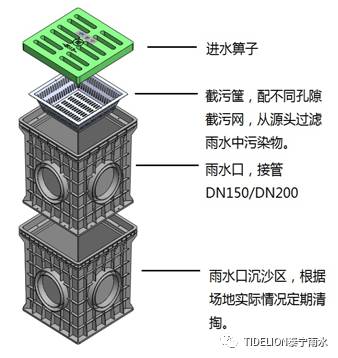 (3) 入口(前端)过滤装置 ▲环保雨水口 环保型雨水口是在所有进水起端的雨水口,均设置有截污过滤网,和泥沙沉积区,从源头控制地面径流的污染,保证进入雨水收集池的雨水水质,简化后期处理工艺。
