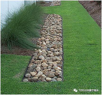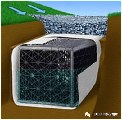 (2) 渗透沟 对于大面积绿化、硬化面积较大时,采用渗透式PP模块暗沟,收集地面径流雨同时,暗沟具有较大储水容积,同时储存在暗沟内的雨水通过渗透方式涵养土壤。