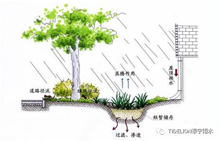 (1) 雨水花园(生物滞留池) 利用景观竖向设计,将雨水径流通过绿化滞留、过滤、储存后溢流至市政管道或雨水收集池。 雨水花园示图