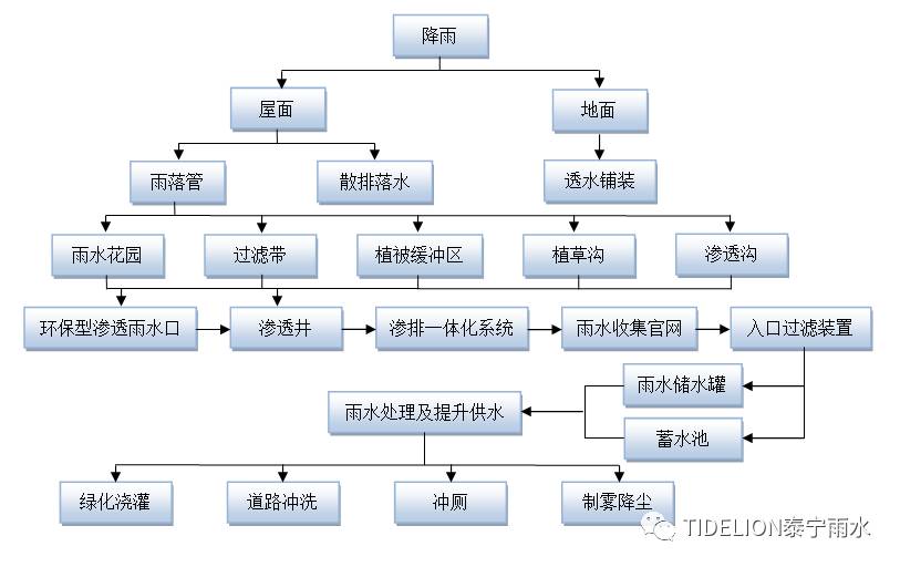 项目通过完善和改变雨水汇流路径、增加雨水生物滞留措施与植被缓冲区、雨水渗透设施、入口过滤截污措施、增加地面透水率、雨水收集直接利用、雨水处理回用等几个方面展开设计,主要工艺流程如下图: