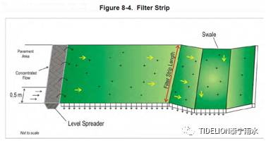 (7) 过滤带、植被缓冲区、植草沟 对于汇水量较大的硬化地面、道路、广场,采用如图所示的绿化洼地、绿化草沟形式,增加雨水滞蓄和渗透能力。