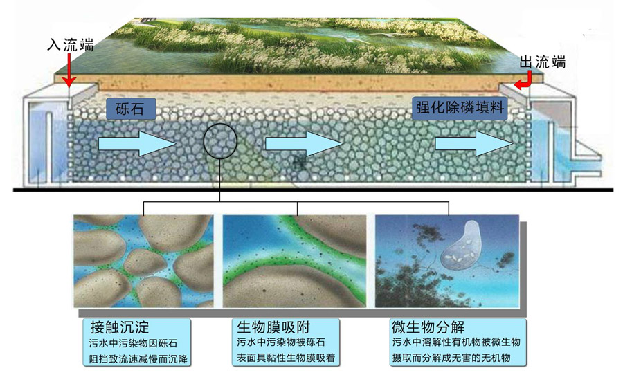 漂浮式水处理系统是一种 高效的接触氧化法处理器,设 备浮于河湖中 , 省却了土建投资 ; 利用河湖自然水体沉淀,不额 外占用空间;处理机理包括活 性污泥法与生物膜法,运行的 同时对水体曝气, 改善水体复氧, 促进生物的自然净化作用;与 砾间等技术组合,可大大降低 水中 SS 浓度, 改善水体透明度。