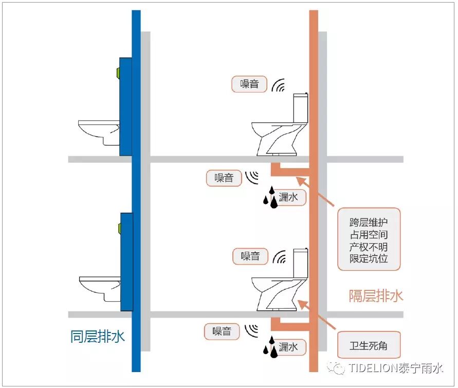 为了避免上面的问题,同层排水系统是最佳选择。 什么是同层排水系统??? 简单来说,同层排水系统就是在本层敷设排水管道! ▲同层排水系统与隔层排水系统对比 同层排水:同楼层的排水支管与主排水支管均不穿越楼层,在同楼层内连接到主排水立管。 隔层排水:同楼层的排水支管与主排水支管穿越楼层,在下一楼层内连接到主排水立管。 同层排水系统的优点